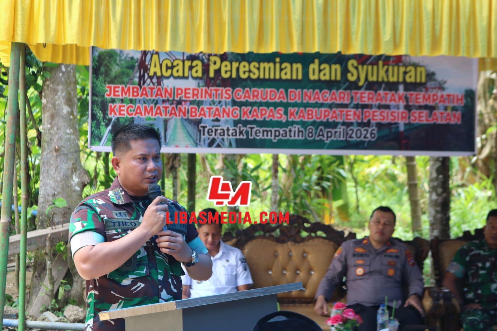 Pesisir Selatan–Dandim 0311/ Pessel Letkol Czi Theodurus Sambua,ST,M.Han didampingi unsur Forkopimca Batang Kapas, Kabupaten Pesisir Selatan, Rabu (8/4/2026) meresmikan jembatan gantung Perintis Garuda.